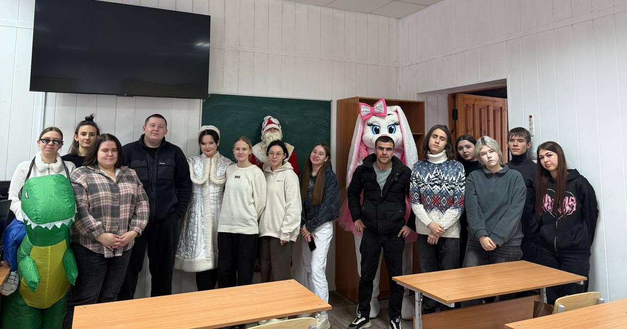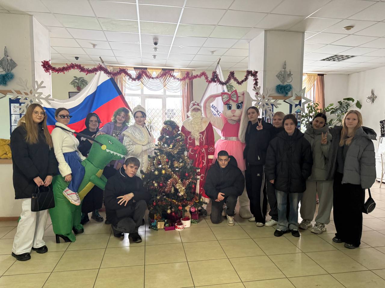 Под звучание новогодних песен Дед Мороз, Снегурочка и другие сказочные персонажи поздравили коллектив и студентов филиала. Студенты и преподаватели пели песни, читали стихи и говорили поздравления, а Дед Мороз дарил мандаринки как символ предстоящего праздника.